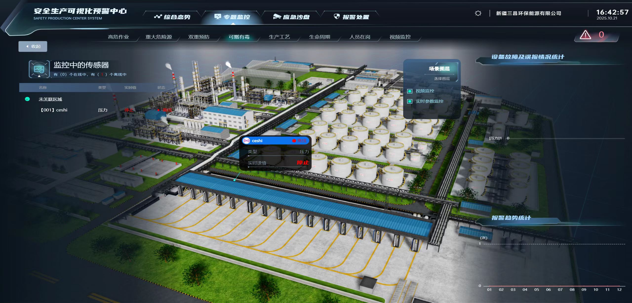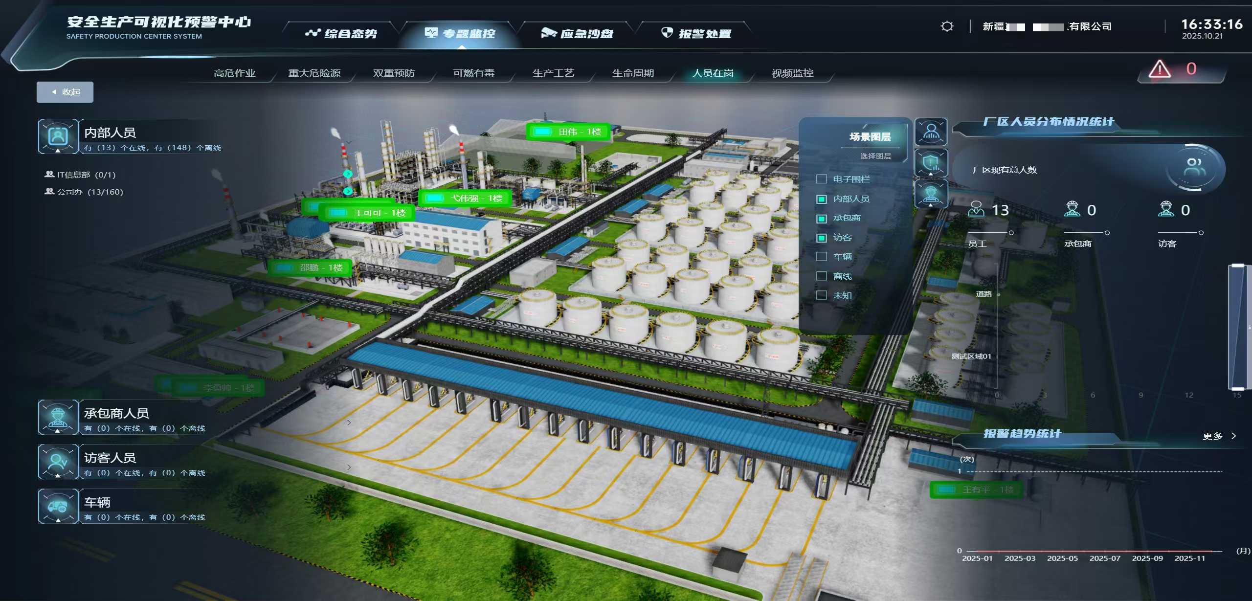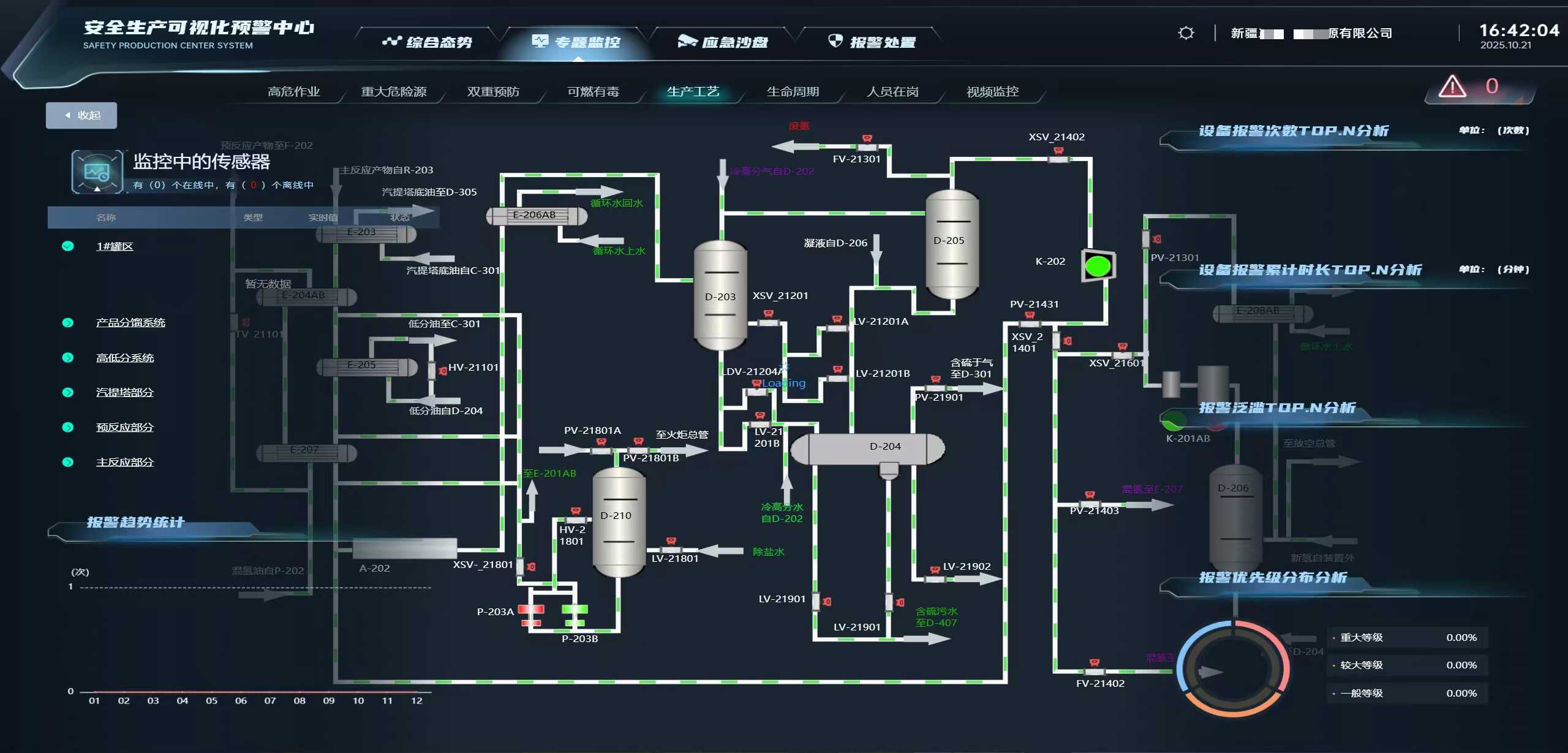动态感知,一图统览:通过物联网技术,平台可实时采集并显示全厂区重点设备、危险工艺环节、环保设施的运行数据及风险点状态,将整个生产基地的安全生产状况动态、直观地呈现于“一张图”上,实现了从被动响应到主动预警的转变。